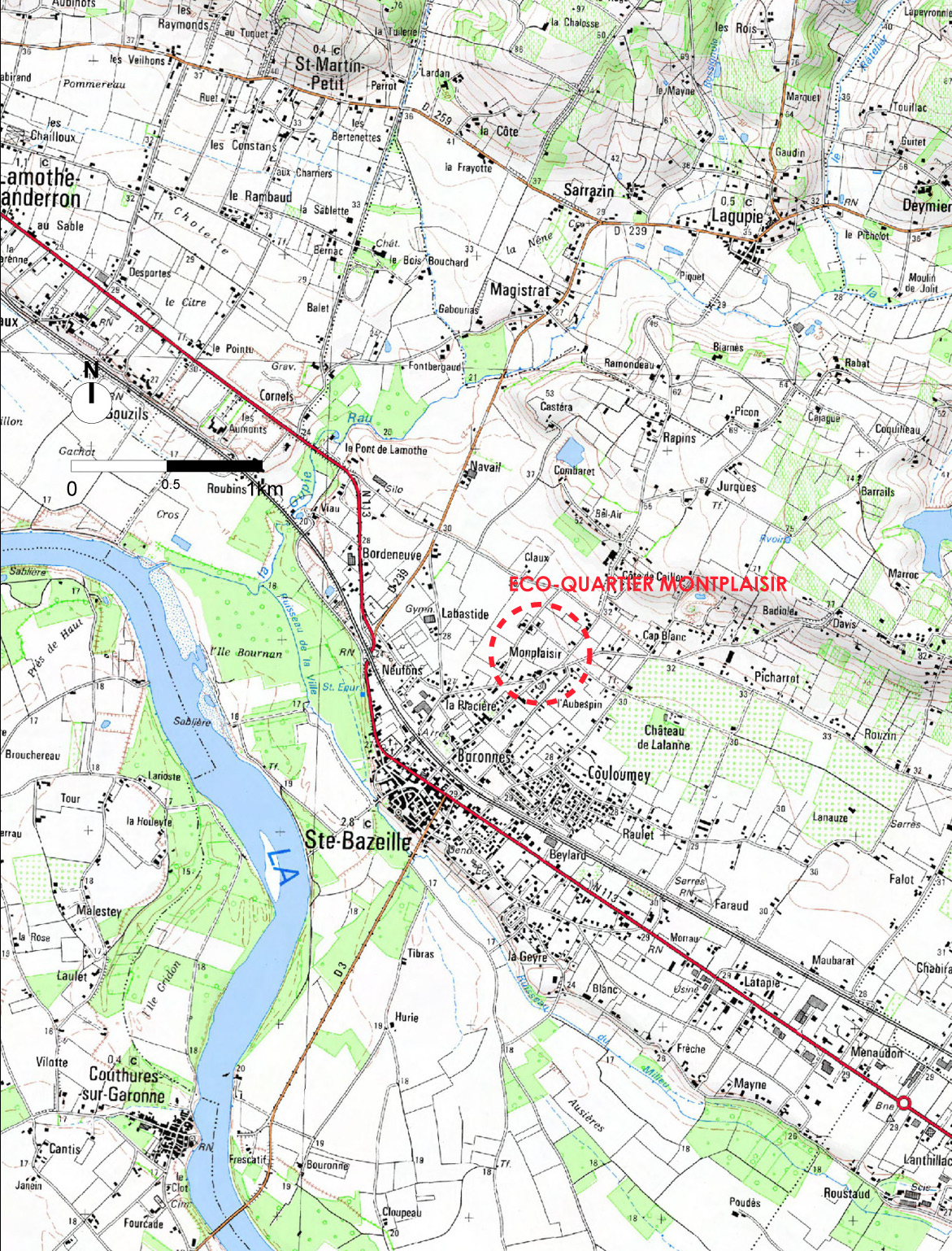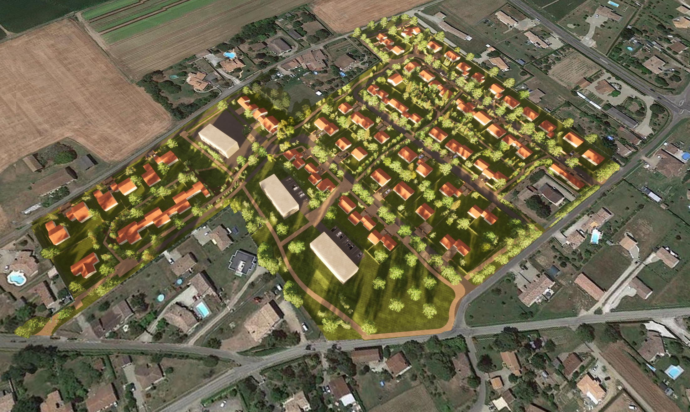 Le projet concerne les tranches 2 et 3 de l’écoquartier de Sainte Bazeille. Cet écoquartier est le premier du département du Lot et Garonne et se caractérise par son inscription en milieu rural. Le plan masse tire parti des noues naturelles du site et de la jonction future avec le tissu ancien de façon à ce que dans le temps et pour des raisons durables, l’ensemble présente une composition cohérente et homogène. La mission d’urbanisme ne prévoit pas de mission de maitrise d’oeuvre du bâti. Le parti d’aménagement a été conçu pour favoriser des constructions mitoyennes afin que la forme urbaine s’apparente à un quartier composé de rues.