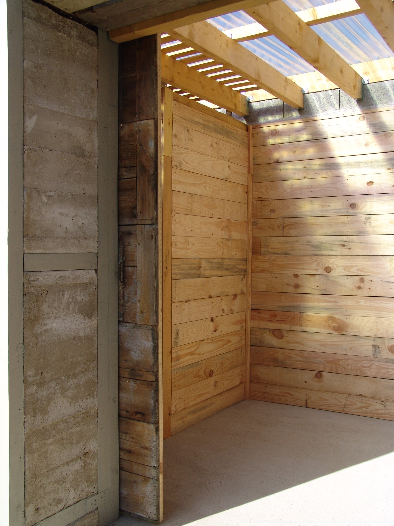 Pensée pour clore un jardin, cette auto-construction développe un long mur en pierres sèches de la région, rythmé par des poteaux bois verticaux de chaque côté d’une grande porte de bois coulissante (volets de récupération bois).